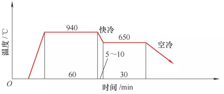 等溫退火工序?yàn)殄懠冗M(jìn)高溫加熱區(qū),由室溫加熱至940℃,并保溫一段時(shí)間,使其充分奧氏體化,然后進(jìn)入快冷區(qū),在5~10min內(nèi)從950℃快冷至650℃,使鍛件快速進(jìn)入正確相變區(qū)間,再經(jīng)650℃保溫,使鍛件充分相變至鐵素體 珠光體組織,送出爐外空冷至室溫。工藝曲線如圖2所示。