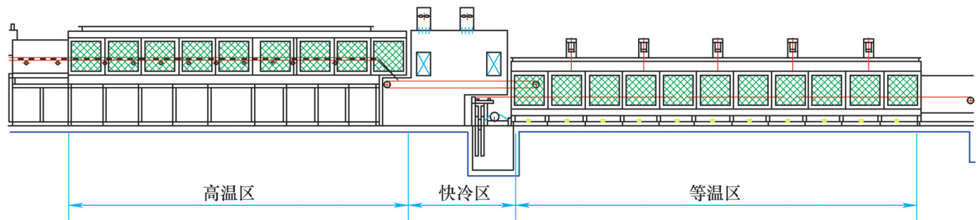 鍛件材質(zhì)為20CrMnTi,設(shè)備為等溫退火連續(xù)爐(見(jiàn)圖1),由高溫區(qū)、快冷區(qū)和等溫區(qū)組成。