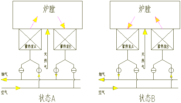 狀態(tài)B,空氣經(jīng)蓄熱室B預(yù)熱后與燃料共同進(jìn)入燃燒室,燃燒產(chǎn)生的yan氣在蓄熱室A中發(fā)生熱交換后排出。